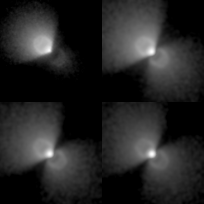Figure 1. Data on HL Tau. The top left panel is an HST WFPC2 image at V-band (Stapelfeldt et al. 1995). The others are adaptive optics near-IR images from Close et al. (1997). The top right image is at J-band (1.25 microns), the bottom left is at H (1.65 microns), the bottom right is K (2.2 microns).