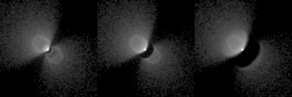 Figure 3. On the left is the same V-band model as in Figure 5 shown at full resolution (0.455"/pixel). This includes a 40 AU radius disk as described in Fig. 5. The middle panel shows our best fit model for a disk size of 80 AU, and the right panel shows the same for a disk size of 160 AU. In all of these models, the disk flaring and inclination were chosen to give the best fluxes and image morphology. In fact, the fluxes are all in good agreement with the data. However, it is clear from these that a large disk is distinctive at all wavelengths. NICMOS imagery will be very useful in helping to determine if a flared disk is the source of the optical extinction and if so, how big it is.